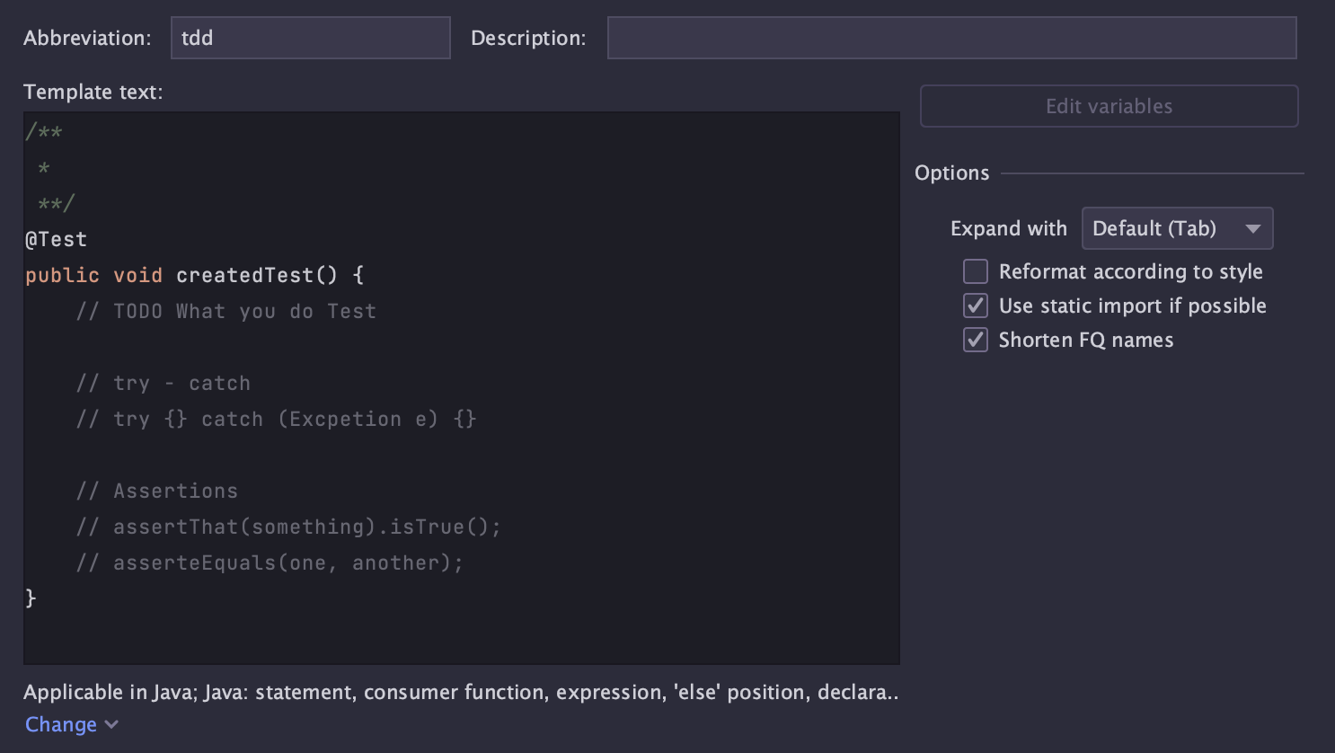 - Template text: 여기에 들어가는 내용이 Live Template 를 사용하였을 때 나타나는 내용입니다.