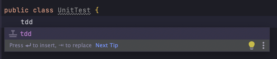 생성 후 OK를 눌러 저장을 하고, 테스트 클래스 아무거나 생성하여 들어가봅니다. tdd 라는 키워드를 입력만해도 아래와 같이 출력됩니다.