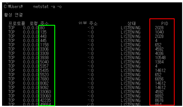 netstat -a -o 입력