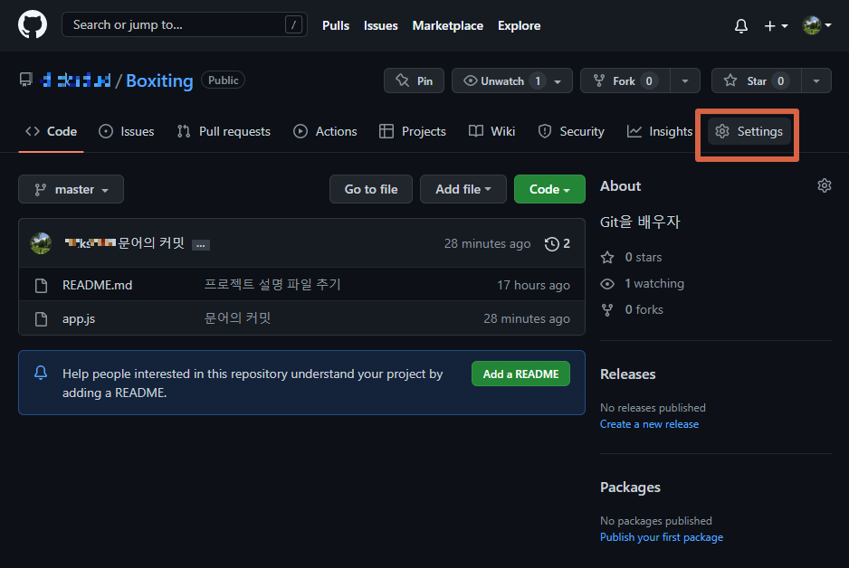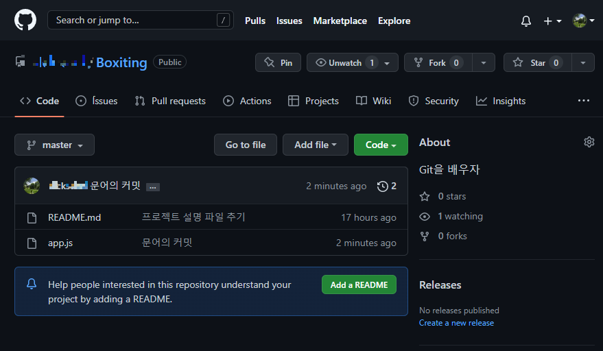 내 계정에 Boxiting이라는 원격저장소가 생성이 된 것.