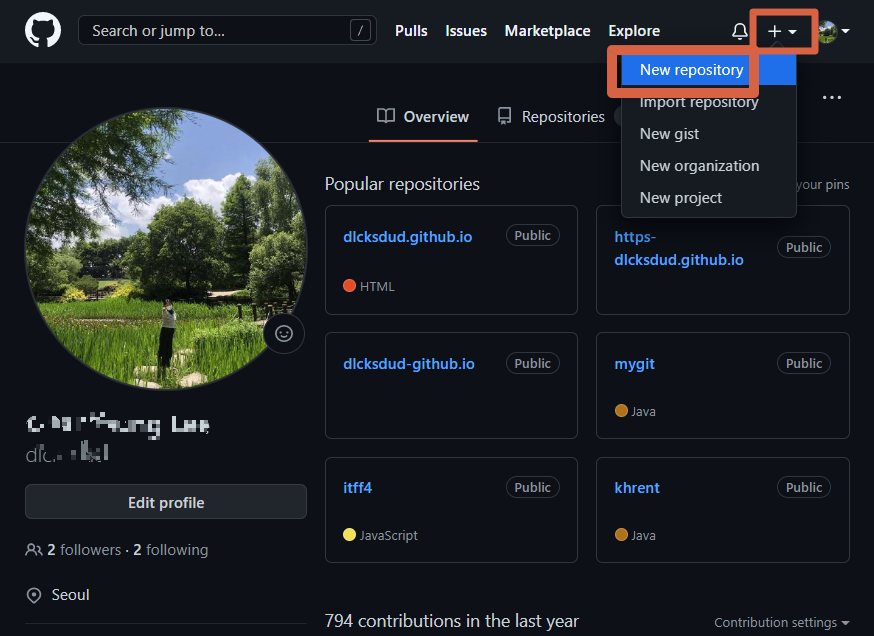 - GitHub 내 프로필에 + 버튼 > New repository\