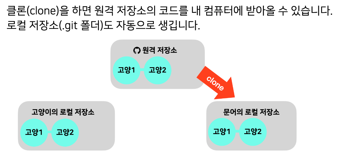 - 원격 저장소에서 내 컴퓨터로 코드를 받아오면 로컬 저장소가 자동으로 생긴다.